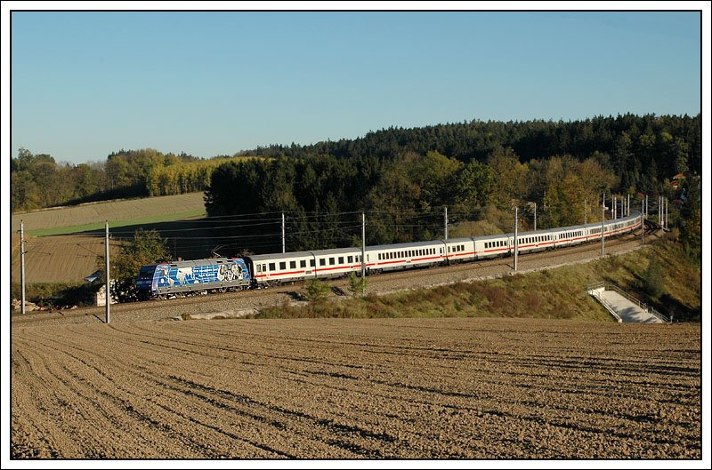 101 102-2 mit dem EC 22 von Wien Westbahnhof nach Dortmund Hbf. am 14.10.2007 kurz vor der Durchfahrt in Haidingen. (zum Bild)