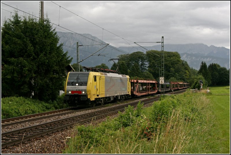 E189 907RT fährt "noch im alten Werbekleid" mit einem kurzen leeren Autozug aus Italien nach München. Hier bei Oberaudorf am 06.07.07 (zum Bild)