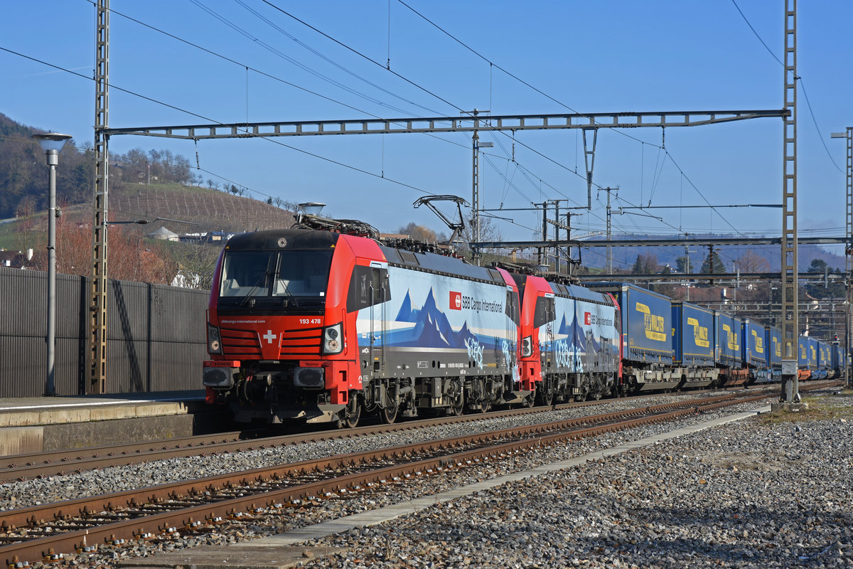 Doppeltraktion, mit den Loks 193 478-5 und 193 470-2 durchfährt den Bahnhof Gelterkinden. Die Aufnahme stammt vom 19.01.2019. (zum Bild)