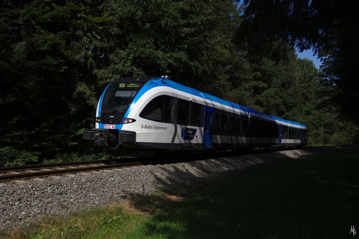 VT63.08 auf der Fahrt nach Wies-Eisbiswald. In dem Waldstück kurz vor Schwanberg befand sich noch 2016 ein mit Andreaskreuz gesicherter Bahnübergang, der zum Zeitpunkt des Fotos verschwunden war. (12.09.2018) (zum Bild)