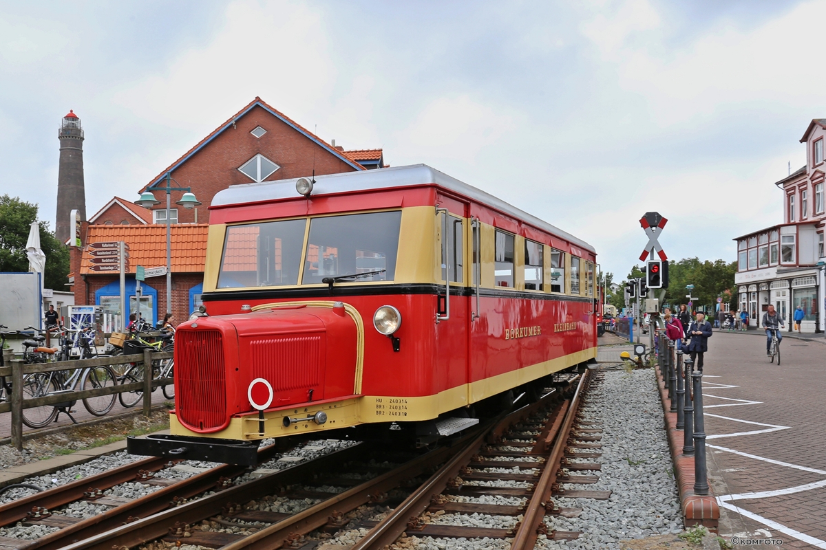 Wismarer Schienenbus T1 der Borkumer Kleinbahn am Inselbahnhof am 10.07.2018. Der Triebwagen wurde 1940 von der Borkumer Kleinbahn gekauft und fuhr bis 1976 im Planverkehr der Inselbahn. Nach seiner Ausmusterung wurde er 1977 mit neuer Hauptuntersuchung an die DGEG verkauft, die jedoch keine dauerhafte Verwendung für den Triebwagen hatte. Über die Umwege Jagsttalbahn und Viernheim wurde der T1 1997 von der BKB wieder erworben und in der eigenen Werkstatt restauriert, neu motorisiert und fährt seit 1998 wieder regelmäßig auf Borkum. Hersteller: Waggonfabrik Wismar, Typ: Hannover D, Baujahr: 1940, Fabrik-Nr.: 21145, Spurweite: 900mm, Länge: 11,35m, Breite: 2,40m, Radstand: 4,00m, Dienstgewicht: 6,5t, Geschwindigkeit: 30km/h, Sitzplätze: 40, Motorisierung: Ford BB Benziner 2 x 37kW(55PS) ab 1998 Daimler-Benz Diesel 2 x 40kW(40PS) (zum Bild)