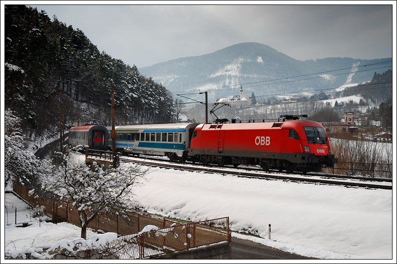 OEC 151 "Emona" von Wien nach Ljubljana (Laibach) war am 21.3.2009 mit 1116 241 bespannt. Die Aufnahme entstand kurz nach Gloggnitz mit dem Schloss Gloggnitz im Hintergrund. (zum Bild)