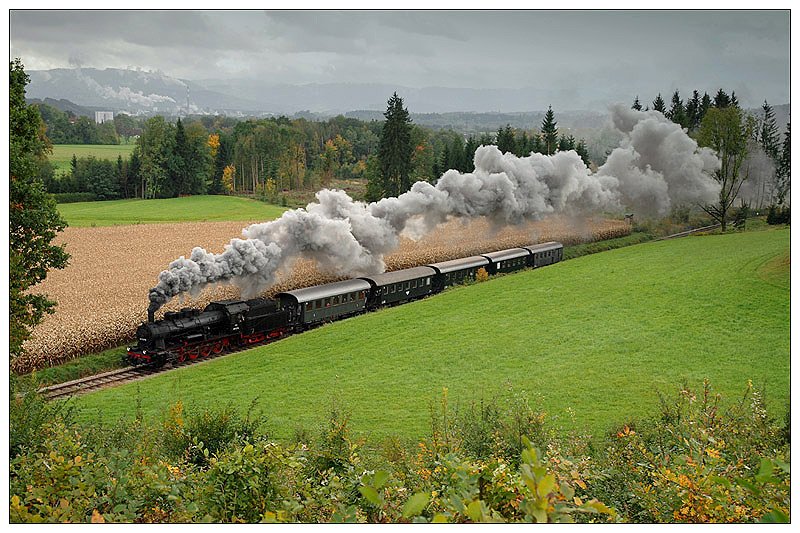ÖGEG 657.2770 mit einem Personenzug, welcher am 4.10.2008 anlässlich der Ampflwanger Dampftage in Verkehr gesetzt wurde, aufgenommen kurz nach Timelkam. (zum Bild)