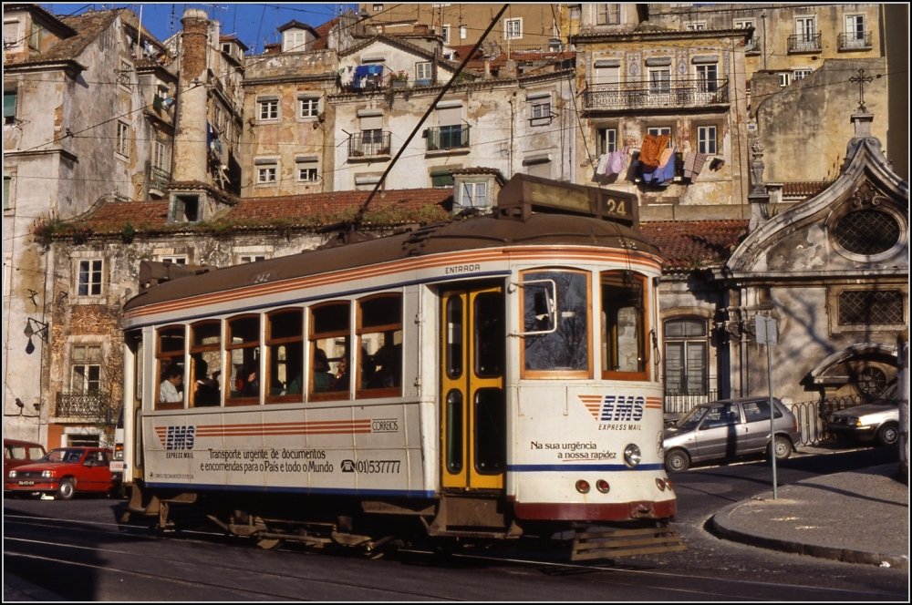 Das Flair war schon bezaubernd, auch wenn einem schon klar ist, dass seit dem Mietpreisstop von Salazar in den 30ern die alten Häuser komplett verfallen. Da sieht der olle Zweiachser noch richtig modern aus, vor allem mit seinen schicken Automatiktüren. Wägen noch mit den handbedienten Gittern habe ich leider zu spät gejagt (Eigentlich hatte ich dummerweise keine Straßenbahnen gejagt), da waren die EU-Gelder schon verbaut...