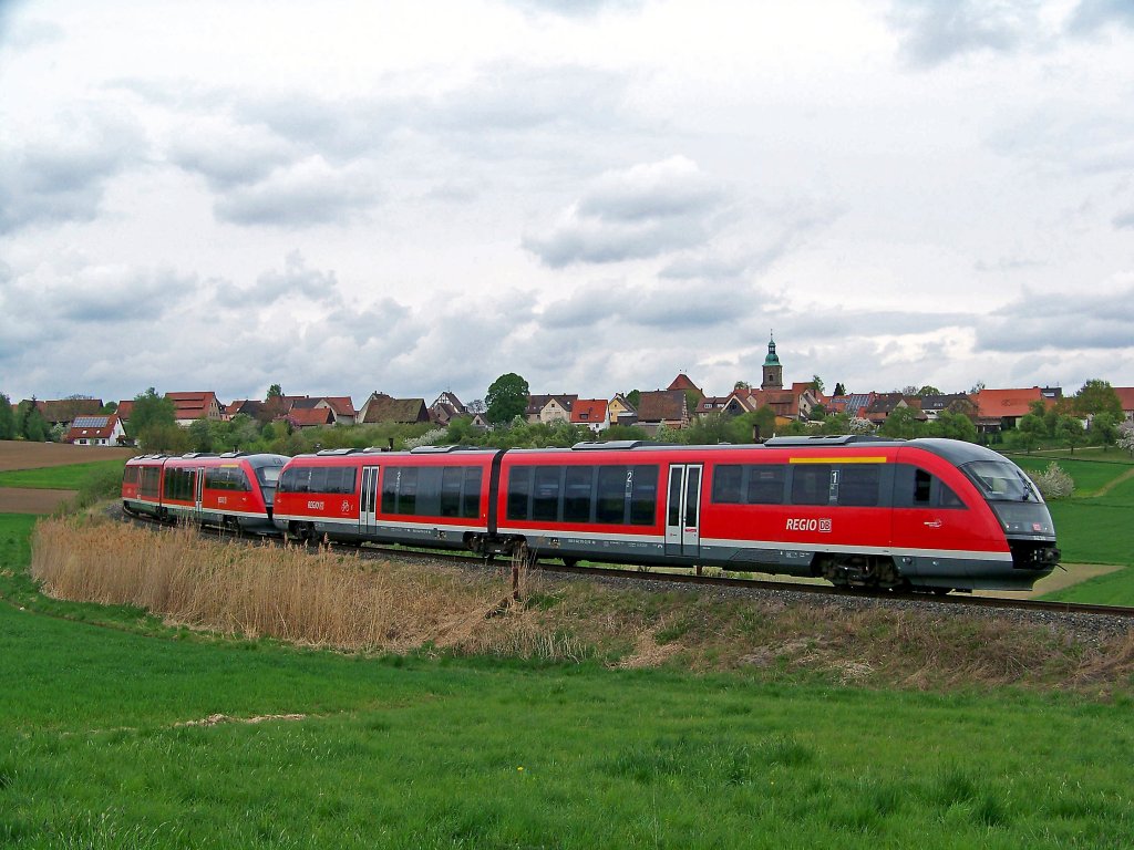 Danke dir fürs Lob, Jens! Dass an diesem Tag in Doppeltraktion gefahren wurde, hat leider das Dorf Kalchreuth in den Hintergrund rücken lassen. An dieser Stelle gibt es auch sehr viele Kirschbäume, deren Blüte ich aber um einige Tage verpasst habe... Weiterhin ist mir aufgefallen, dass der hintere 642er auf diesem Bild einen gelben 1.-Klasse Streifen über den (in Fahrtrichtung) rechten, vorderen Fenstern hat - auf Bild-Nr. 403602 ist der entsprechende Bereich in Fahrtrichtung links als 2. Klasse gekennzeichnet ;)