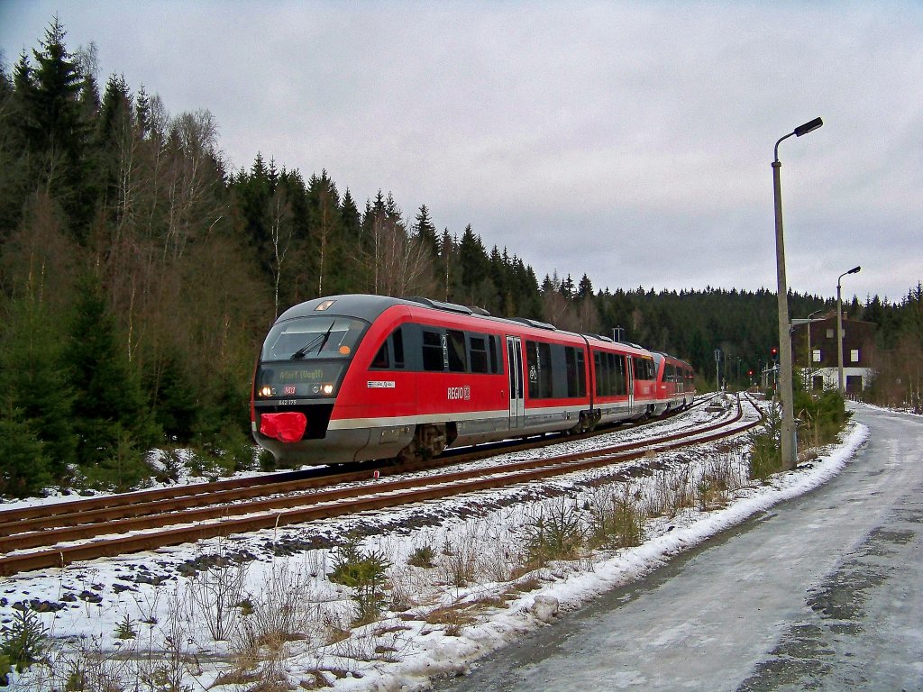 dieser Zug der Linie RE17 kam aus Leipzig. Als Wintersportzug verkehrt er nur am Wochenende in der Wintersport-Saison. Ein Zugteil fährt nach Johanngeorgenstadt via Zwickau, der andere nach Schöneck. Dieser Teil endet planmäßig in Adorf und wird dann auch dort abgestellt, allerdings war kein Fahrgast mehr auf dem weg nach Adorf... Danke dir fürs Lob!