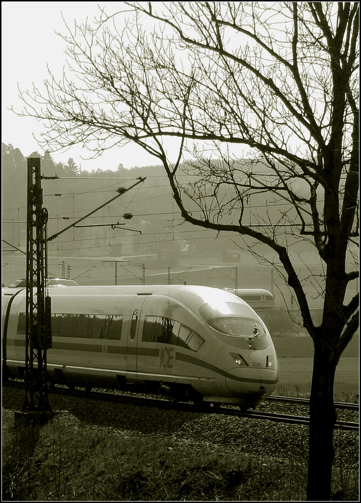 An dieser Fotostelle hat man kaum Warnzeit für einen Zug. Es huscht mit 150 Km/h an dem Fotografen (also mir) vorbei und kommt dabei um die Kurve.