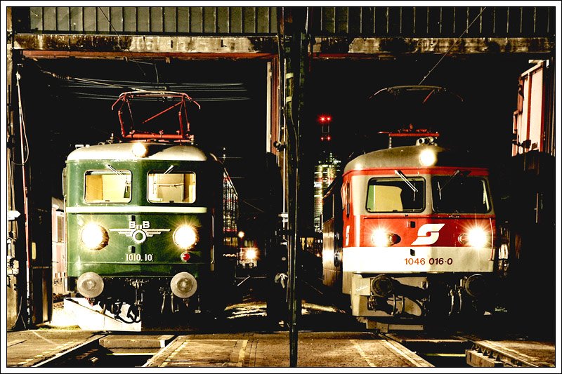1010.10 und 1046 016 im März 2008 in Wien Nord aufgenommen. Im Hintergrund ist der Büroturm Millennium Tower am Wiener Handelskai im 20. Wiener Gemeindebezirk Brigittenau zu sehen. (zum Bild)