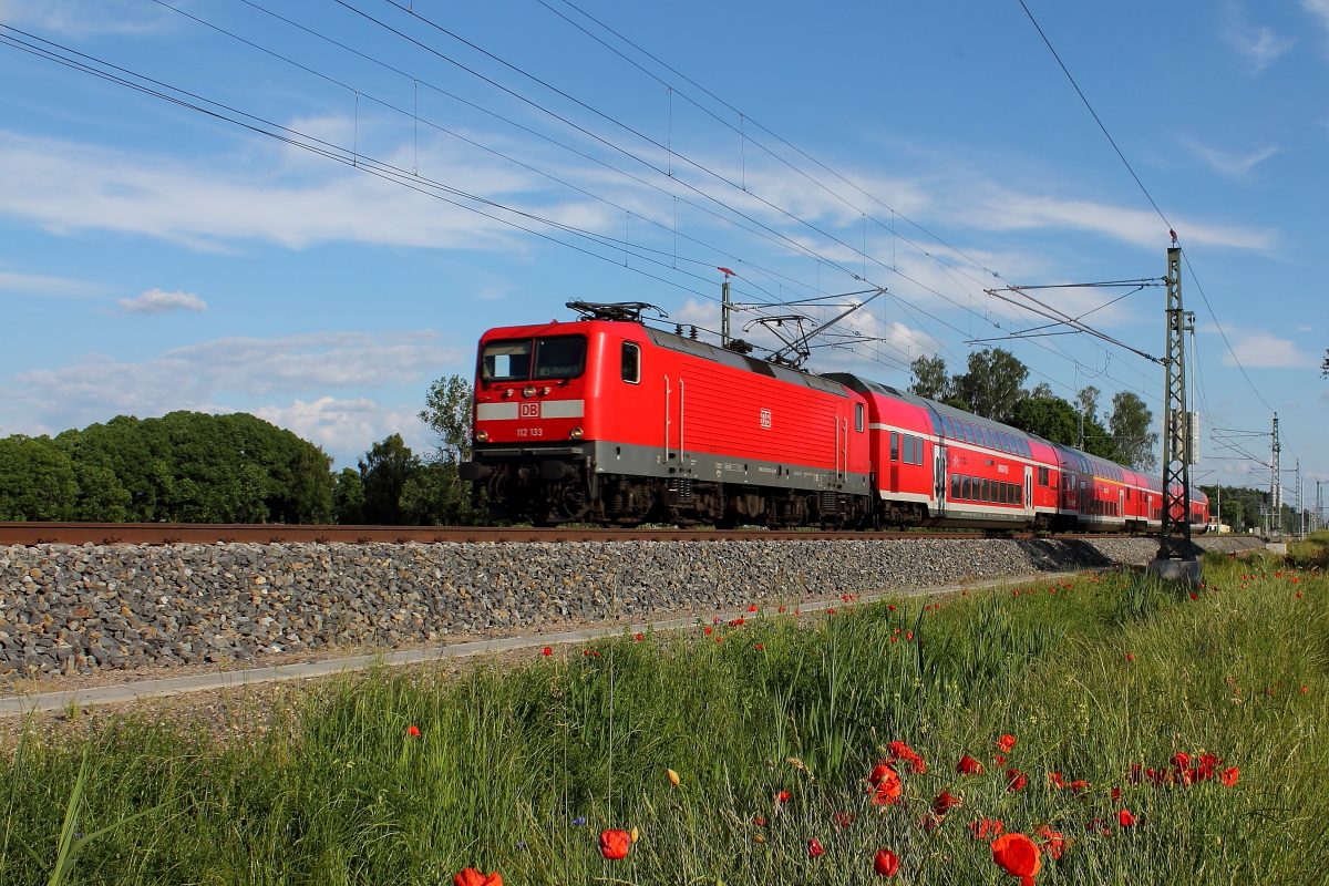 der Klatschmohn im Vordergrund passt farblich perfekt zum Triebzug.