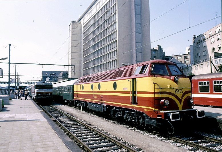 Lok 1815 in Luxemburg Bahnhof. Links ist gerade die SNCF 15004 aus Basel angekommen. 6.Juli 1989. (zum Bild)