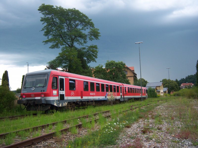 628/928 335 steht im Sommer 2008 bei bedrohlicher Gewitteratmosphäre im ehemaligen Isnyer Teil des Keilbahnhofs von Leutkirch abgestellt. 5 Minuten später gab es den totalen Wolkenbruch. (zum Bild)