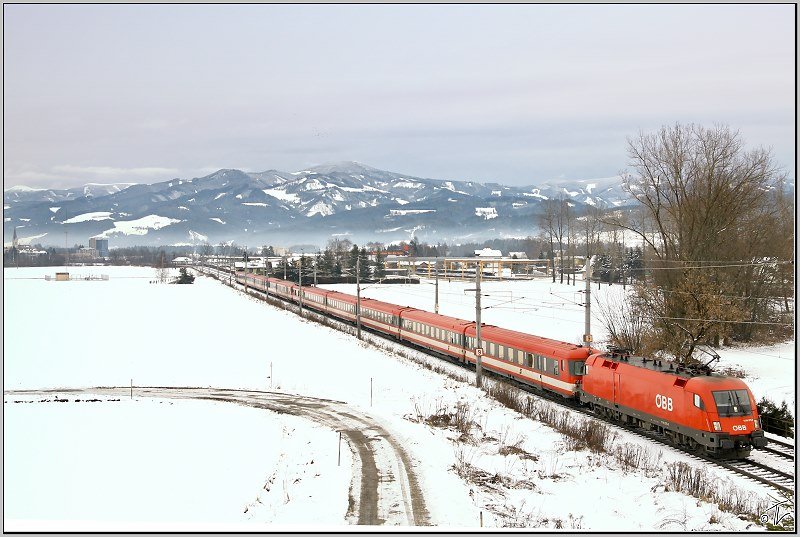 Aufgrund von Entlastungszügen in der Weihnachtszeit bekamen wir im Oberen Murtal nochmals Triebzüge der BR 4010 zu sehen.Leider bekam der Zug in Wiener Neustadt einen Vorspann mit der 1116 279.Dahinter die beiden 4010 016 & 009 als IC 15535 von Wien Süd nach Villach. Zeltweg 20.12.2008 (zum Bild)
