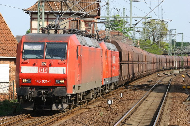 145 031 und 145 020 mit Güterzug von Wittenberge kommend fährt in Ludwigslust ein. 03.05.2007 (voir l'image)