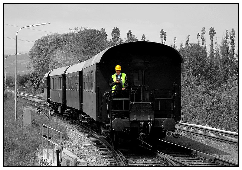 Der Mann mit er gelben Weste ist Vorschriftsgemäss; das Schlusssignal sollte auch noch rot sein ...