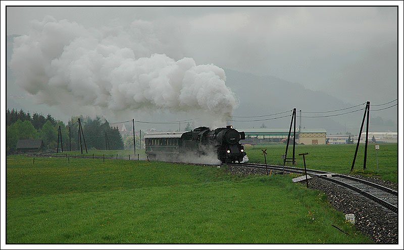 René Pansi habe ich diese Serie zu verdanken. Ursprünglich wollte ich wegen der schlechten Witterung am 4.5.2007 nicht fotografieren gehen, aber er hat mit dazu überredet, was ich im Nachhinein nicht bereue. Kalt war es, und wegen dem starken Regen bereits völlig durchnässt, warteten wir am Obdacher Sattel auf die Ausfahrt des LPz 32171 von Zeltweg nach Wolfsberg in Kärnten. Grund der Fahrt: 52.4984 bespannte am 5.5.2007 einen Sonderzug von Wolfsberg nach Jesenice (SLO) (voir l'image)