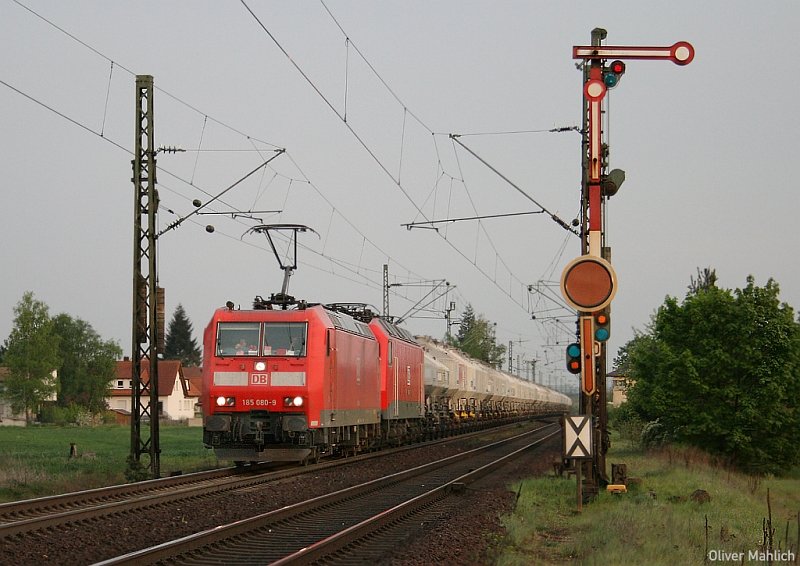 Ausnahmefall: Bei bedecktem Himmel durchfahren am Abend des 24. April 2007 die DB-185 080 und MEG 804 (ex 156 004) den Bahnhof Hirschaid bei Bamberg. Planmäßig wird der gezeigte Zementzug von den MEG-eigenen 143 in Doppeltraktion bespannt. (voir l'image)