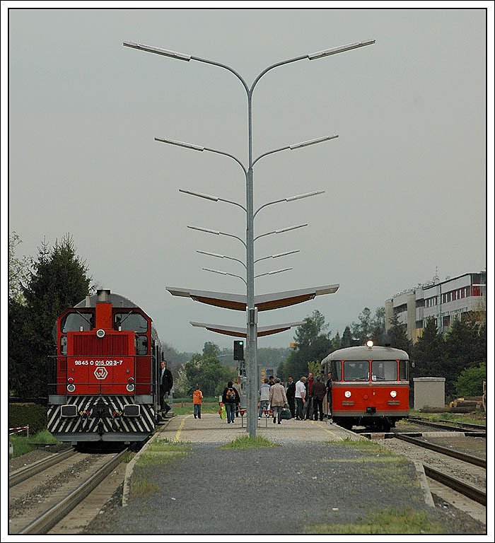 Der ehemalige GKB Triebwgen und heute im Besitz der Steirischen Eisenbahnfreunde (Stef) stehene VT 10.02 mit den beiden Beiwagen VB 10.02 und VB 10.12 als Spz 8436 von Lieboch retour nach Graz am 18.4.2007 bei der Kreuzung mit dem R 8443 nach Köflach, aufgenommen im Bahnhof Straßgang. (voir l'image)