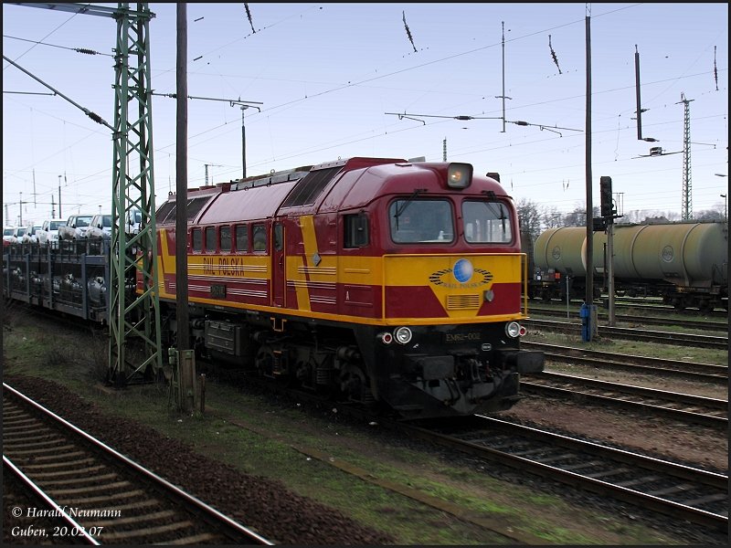 Einen Autozug hat EM62-002 der Rail Polska von Railion in Guben übernommen, um ihn dann über die Grenze zu bringen. (Schnappschuß aus vorbeifahrendem RE-deshalb heute mal mit Mast im Bild-wenns nicht gefällt werd ichs löschen). Guben, 20.02.07 (to the image)