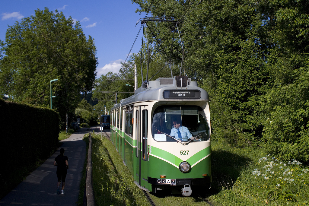 Eine grüne Straßenbahn in einem grünen Ambiente: Sehr schön.