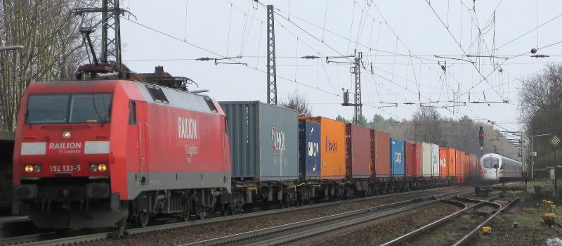 152 133-5 bei der Durchfahrt mit einem Containerzug in den Hamburger Hafen in Radbruch am 31.03.09. Im Hintergrund ist noch der ICE 72237 Hamburg-Altona - Berlin Südkreuz zu sehen. (zum Bild)