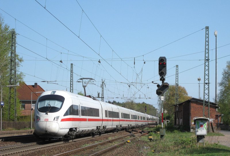 ICE 72237 Hamburg-Altona - Berlin Südkreuz bei der Durchfahrt am 18.04.09 in Radbruch Richtung Uelzen. Ab Uelzen geht es dann über die "Amerikalinie" weiter nach Stendal und Berlin. (zum Bild)