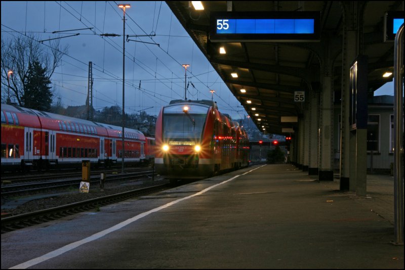 640 009 und 016 sind als RB93 (RB 39670) "Rothaarbahn" von Bad Berleburg nach Siegen im Zielbahnhof angekommen. (zum Bild)