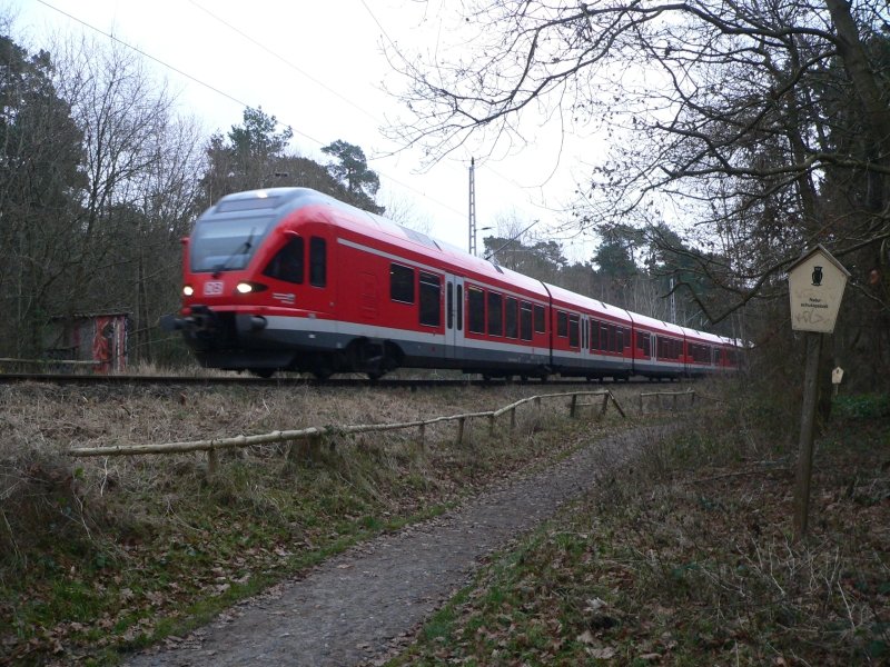 Ein Flirt in Richtung Lietzow rauscht am sonst einsamen Wanderweg zwischen Prora und Lietzow vorbei. Diese Züge werden hier seit 10.12.2007 eingesetzt. Eine Zugbegleiterin, mit der wir ins Gespräch kamen, äußerte aber ihre Zweifel daran, ob der Zug im Sommer ausreichend Plätze - insbesondere für die vielen Fahrräder - hat. Jetzt im Winter sind die Züge hingegen kaum besetzt, wir zählten manchmal nur um die 5 Fahrgäste. 28.12.2007 (zum Bild)