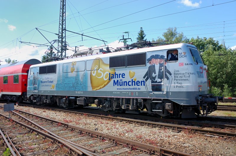 Die Grundfarbe der 111 027 ist silber wie die Porsche-Lok, das täuscht hier nur auf dem Foto etwas.