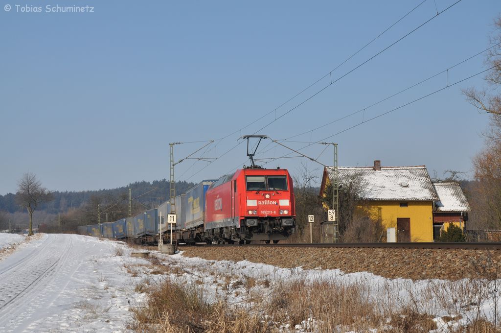 185 213 mit LKW-Walther KLV am 11.02.2012 bei Pölling (zum Bild)