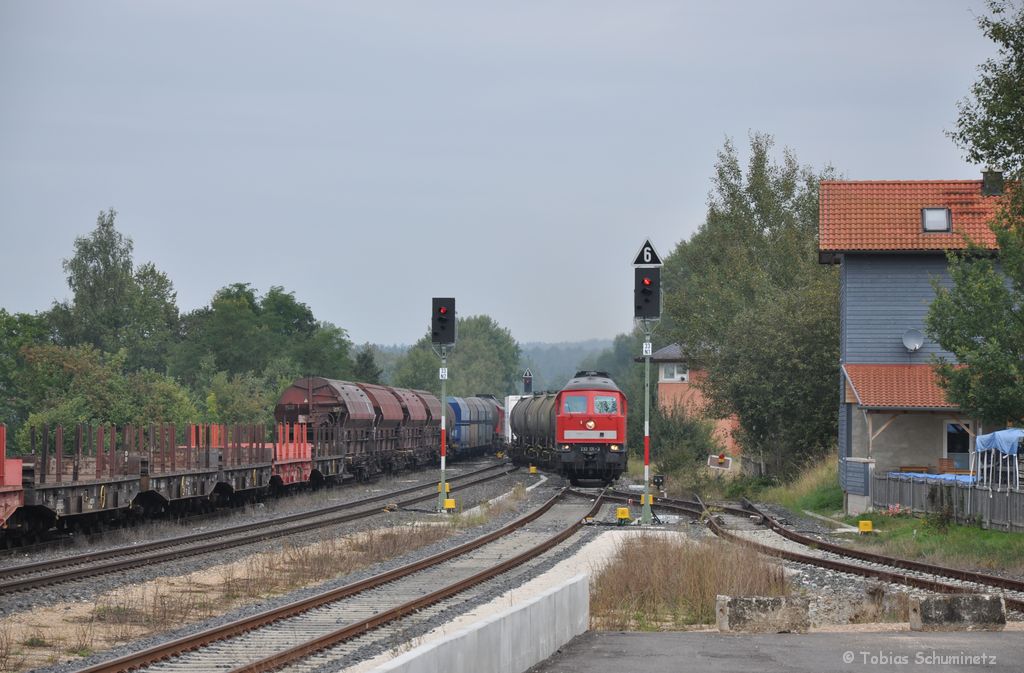 232 131 fährt mit einem Umleiter-Güterzug in Vilseck auch Gleis 1 ein um mit einem entgegenkommenden 610er zu kreuzen während auf Gleis 3 ein Umleiter-Güterzug mit 232 618 auf die Überholung des selben 610ers wartet. Vilseck am 22.09.2011 (zum Bild)