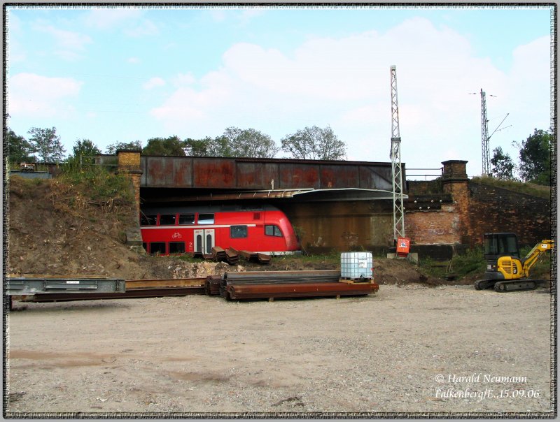 Ein Zug der RE5 Falkenberg/E. - Stralsund fährt gerade durch das Kreuzungsbauwerk Nord in Falkenberg/E. Die Strecke Falkenberg - Wittenberg führt nun z. Zt. eingleisig über eine Behelfsbrücke. (zum Bild)