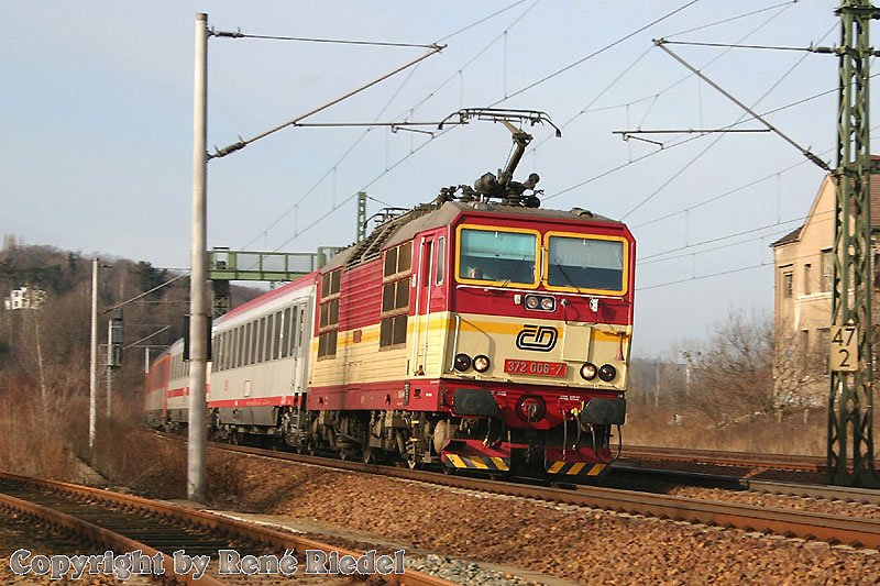 Ein farbenfrohes Design trägt diese Lok. Fahren die Tschechen immer mit dem vorderen Strohmabnehmer, oder gibts da auch verschiedene Wippen wie im Verkehr CH-D? Schönes Bild, auch mit den verschiednenen Fahrleitungsmasten.