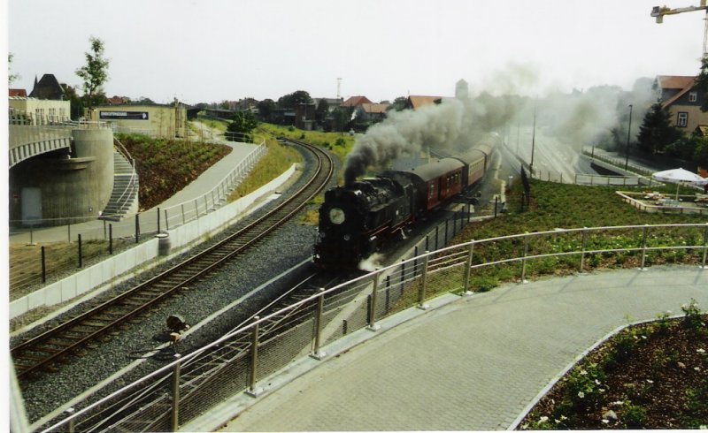 An einem Juli Vormittag macht sich 99 7232 mit ihrem Zug auf den Weg zum Brocken. Passierenn tut sie hier den neuen "Altstadtkreisel" (zum Bild)