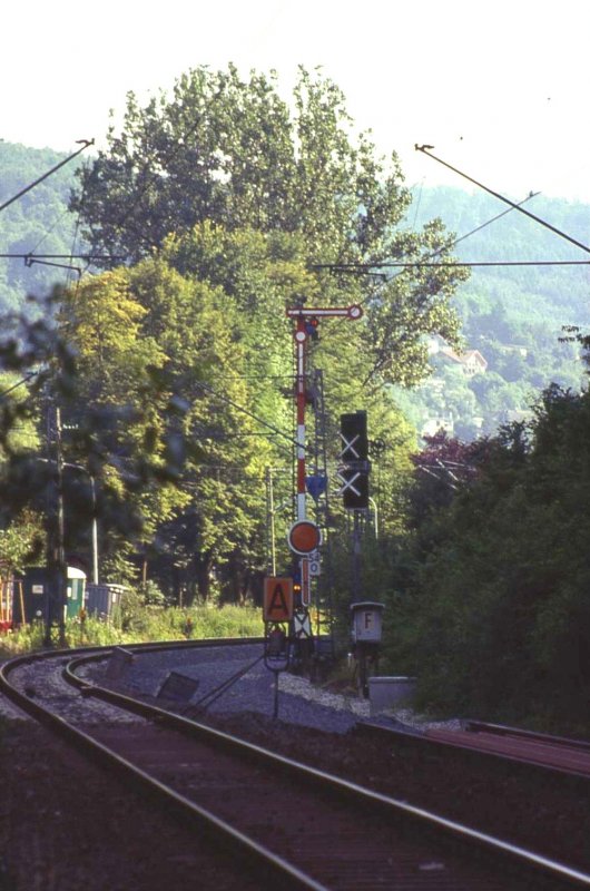 Nach Stilllegung des alten Mosbacher Bahnhofs und Verlegung der Gleise im Zuge der geplanten S-Bahn werden die alten Formsignale durch Lichtsignale ersetzt. Herbst 1996 (zum Bild)