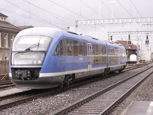 PZB: 527 101-0 Am 28.2.2007 bei Signalhalt im verregneten Bahnhof Gümmligen/BE. Weiterfahrt Richtung Ostermundigen. Aufschrifften unteranderem Simens in Grün. In der Zielangabe steht Trainguart (zum Bild)