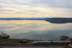 SBB ICN-Neigezug Serie 500 am Bielersee. Die hier noch verbliebene Einspurstrecke verschwindet bald als neue Doppelspur in einem Tunnel. Im Vordergrund entsteht frischer, fruchtiger Wein, im Hintergrund sind schwach die Berner Alpen auszumachen. Zu sehen ist auch die berühmte Petersinsel, wo der Philosoph Rousseau im Jahre 1765 glückliche Tage verbrachte. 24.Februar 2019. (zum Bild)
