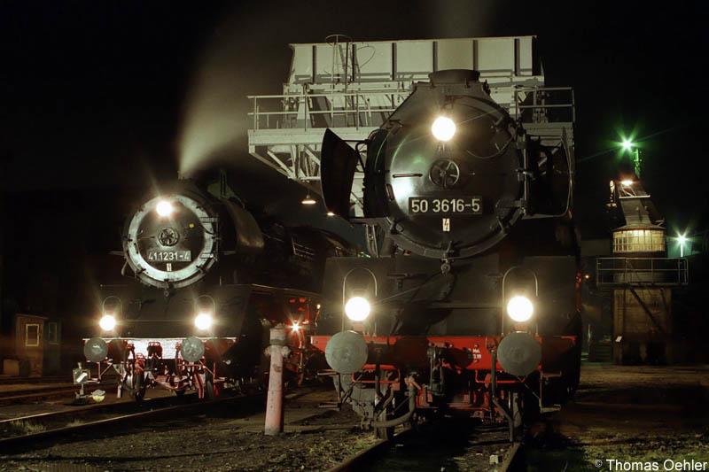 41 1231 und 50 3648 zu nächtlicher Stunde unter dem Kohlehochbunker des Bw Chemnitz-Hilbersdorf im September 2000. (zum Bild)