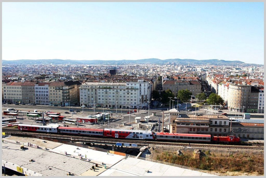 Blick vom Bahnorama-Turm an der Baustelle Hauptbahnhof Wien, die diese 2070 mit einer Wagenüberstellung passiert. 06.09.11 (al imagen)