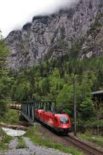 Die Kummerbrücke kurz vor dem Bahnhof Gstatterboden überspannt und ist von hohen schroffen Felsen umgeben. Am 18.5.2023 fährt der SWGN58668 mit der 1116 261 und der 1016 024 von Eisenerz kommend nach Leoben Donawitz über die Kastenbrücke in Richtung Selzthal. (zum Bild)
