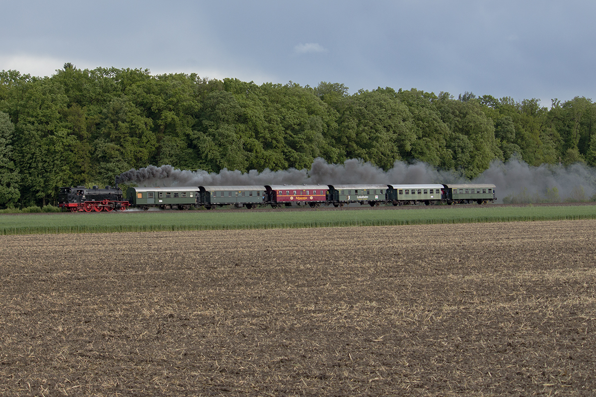 Am Bodo-Erlebnistag am 11 Mai fuhren zahlreiche Sonderzüge, hier eine Dampflok (Baureihe 64) auf dem Weg von Friedrichshafen nach Aulendorf, kurz vor dem Bahnhof Mochenwangen 11.05.2014 (to the image)