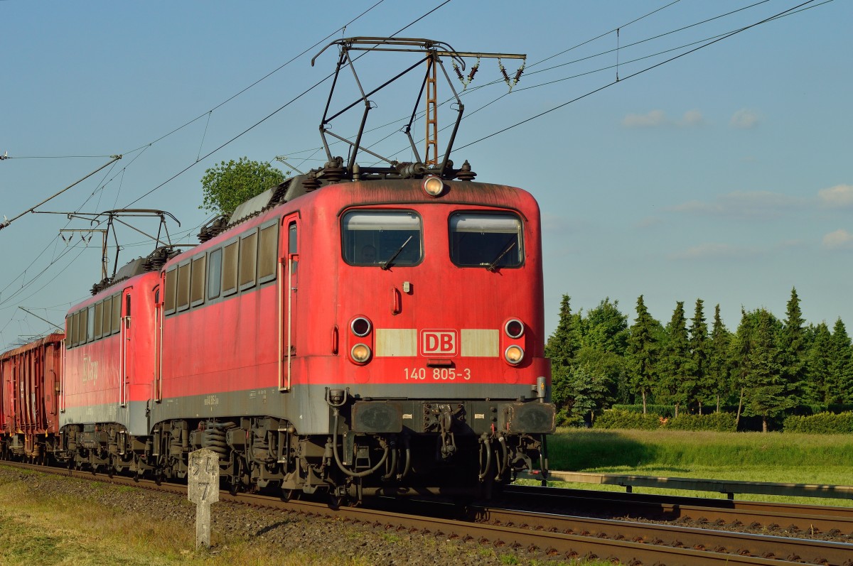 Am Freitagabend den 16.5.2014 kommen bei Wickrath die 140 805-3 und die 140 790-7 mit reichlich Eaos-Güterwagen am Haken gen Aachen fahrend. (to the image)