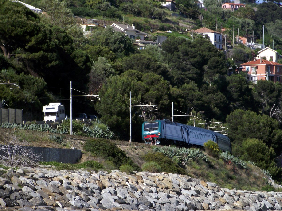 Der REG 10173 (Ventimiglia-Turin), von einer E464 geschoben, nähert sich seinem nächsten Halt, Imperia Porto Maurizio, entlang der ligurischen Meer. San Lorenzo al Mare - 12.05.2014 (to the image)