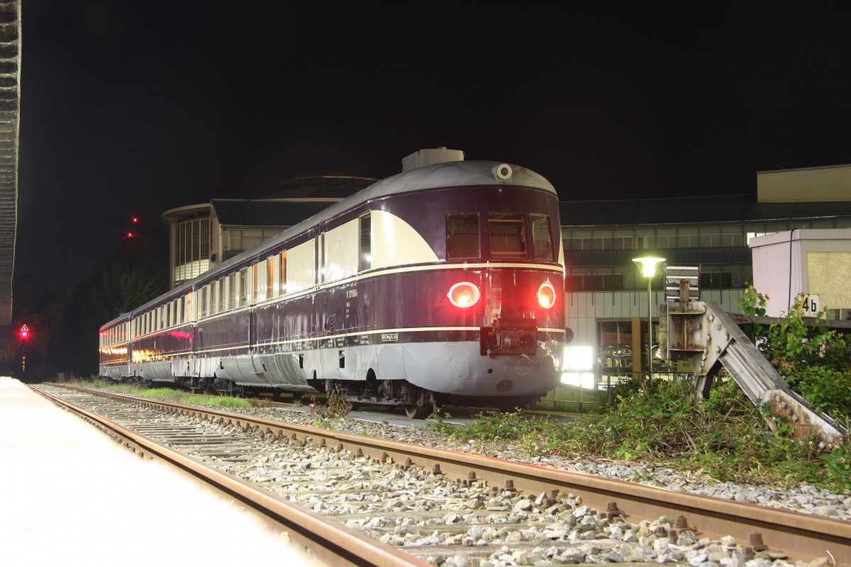Treffen unter Zeitgenossen, VT 137 im Hafenbahnhof Friedrichshafen, der im Bauhausstil errichtet wurde und heute als Zeppelinmuseum verwendet wird. Trotz nächtlichen Widrigkeiten sauber rausgearbeitet... Gefällt mir.