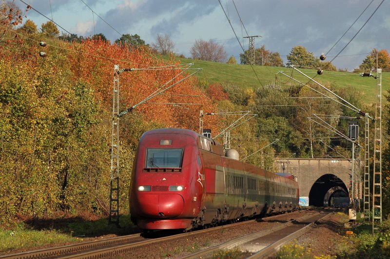 Sehr schönes Bild dieses Thalys PBKA vor der frühherbstlichen Kulisse.