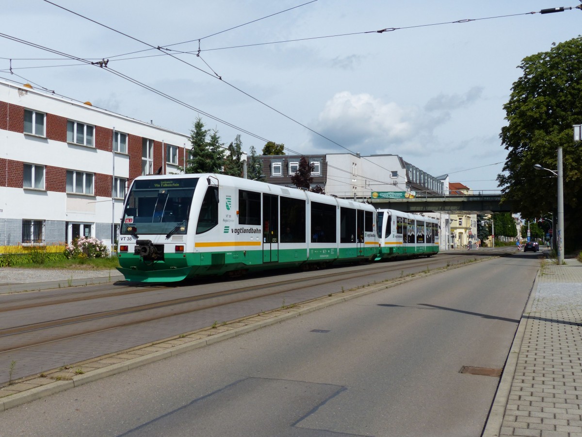 Jubiläum in Zwickau. 15 Jahre Zwickau(Hbf.)-Zwickau Zentrum. Als Sonderzug fuhren VT38 und VT31 als Sonderzug.28.06.2014. (zum Bild)