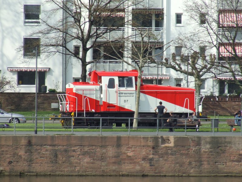 Am 30.03.07 fuhr mir in Frankfurt/Main diese kleine Diesellok mit der Aufschrift Hafen Frankfurt vor die Linse.Die Strecke führt direkt am Main entlang.Villeicht kann jemand eine kurze Info dazu schreiben. (zum Bild)