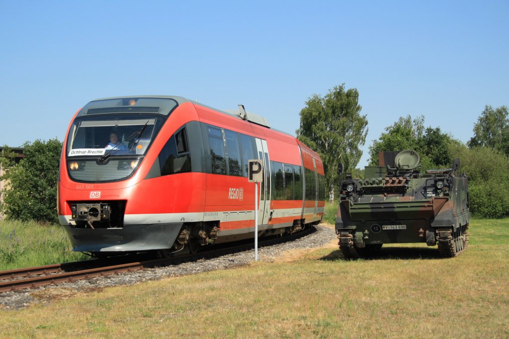 643 065 "Stadt Gronau" neben einem Panzerfahrzeug im Bundeswehrdepot in Ochtrup-Brechte. Ochtrup, 04.06.2011 (do obrazu)