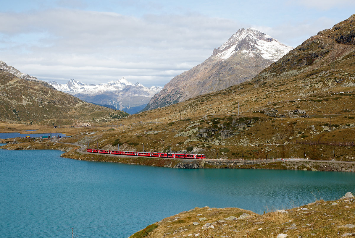 eine wunderschöne Aufnahme von der Berninabahn am Ufer des Lago Bianco, gefällt mir sehr gut.
