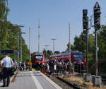 Manchem Bedenkenträger stehen vielleicht die Haare zu Berge, dabei ist das die übliche Situation in Büchen: Egal ob die Fahrgäste aus- oder zusteigen wollen oder umsteigen aus / in Richtung Hamburg oder Berlin - Dresden - Prag oder Schwerin - Rostock, alle müssen durch diesen Engpass übers Gleis während links RE 83 nach Lüneburg und rechts der Gegenzug nach Lübeck - Kiel stehen. Bei hohem Fahrgastaufkommen bzw. knappen Übergangszeiten ist dies besonders spannend. Soviel auch zum Thema Aufenthalt im Gleisbereich; 13.07.2018 (al imagen)