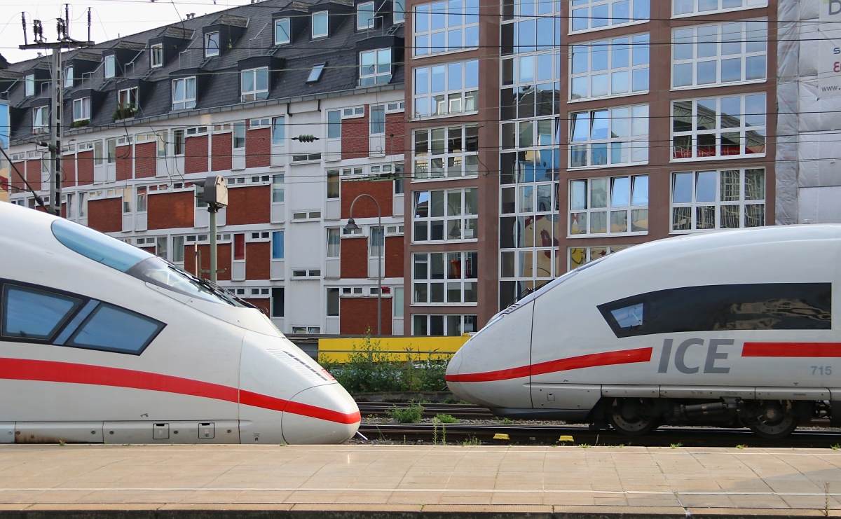 Die Aufnahme gefällt mir ausgezeichnet, da die Köpfe zueinander schauen und auch die Staffelung der beiden Züge kommt schön raus. Der ICE 3 an der Bahnsteigkante, während bei ValeroD ein Teil des Fahrwerks zu sehen ist; dieser Zug im Bild etwas "weiter oben" platziert ist.